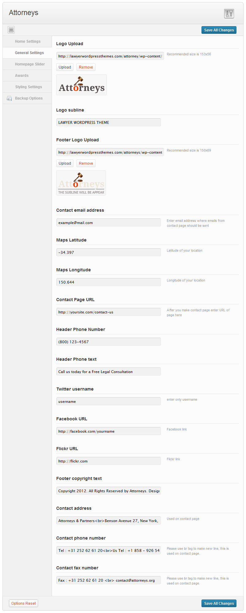 The General Settings tab has options relevant to the entire site and for the contact page such as header logo, footer logo, header phone number, header call to action text, etc.
